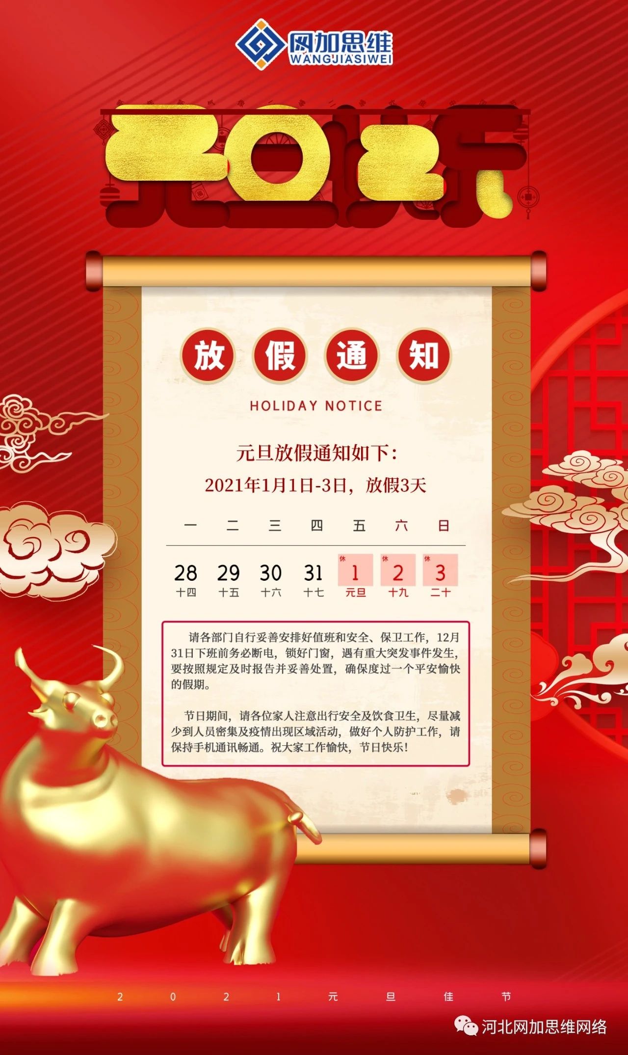 值此新一年到來之際,網(wǎng)加思維全體員工祝網(wǎng)加摯友們:元旦快樂,牛年吉祥,年年皆勝意,歲歲都歡愉。